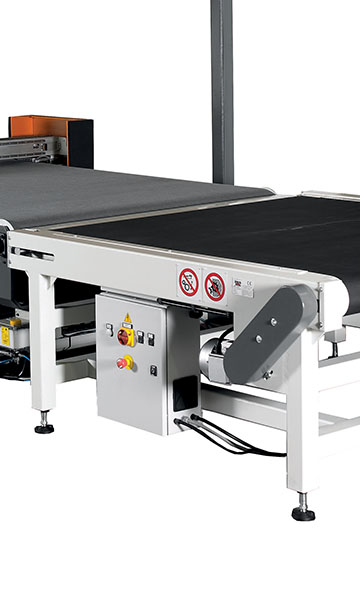 On the conveyorised models, the material feeding is carried out by the combined action of the belt and a pincer mounted on the gantry.