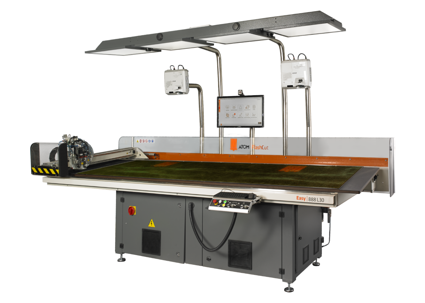 The ATOM FlashCut EASY 888 L30 Inclined CNC Knife Cutting System is the ideal dieless cutting solution for any synthetic material: from the softest leather or elastic textile to hard/heavy leather for soles