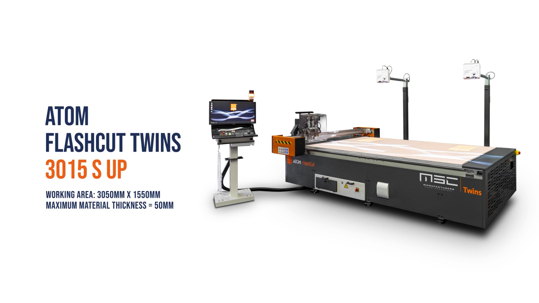 ATOM Digital Knife Cutting Tables & Systems, FlashCut TWINS Series, is a complete line of digital dieless cutting systems available in several configurations with either a static or conveyorized (belt feed) cutting surface capable of processing materials up to 50mm in thickness – cutting solutions for combined jobs.