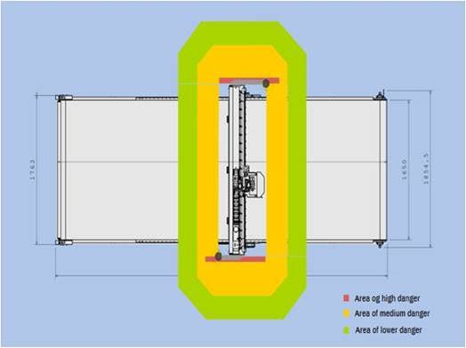 The green area is considered “low danger” and when entered, the machine slows down the operating speed and returns to normal condition once the operator exits this area. The orange area is considered “medium danger” and when the operator enters this area, the machine will be placed in a “hold” position until the operator exits this area. The red area, closest to the moving beam, is considered “high danger” therefore once the operator enters this area the machine stops completely and cuts the main power to the motor (similar to an emergency stop button).
