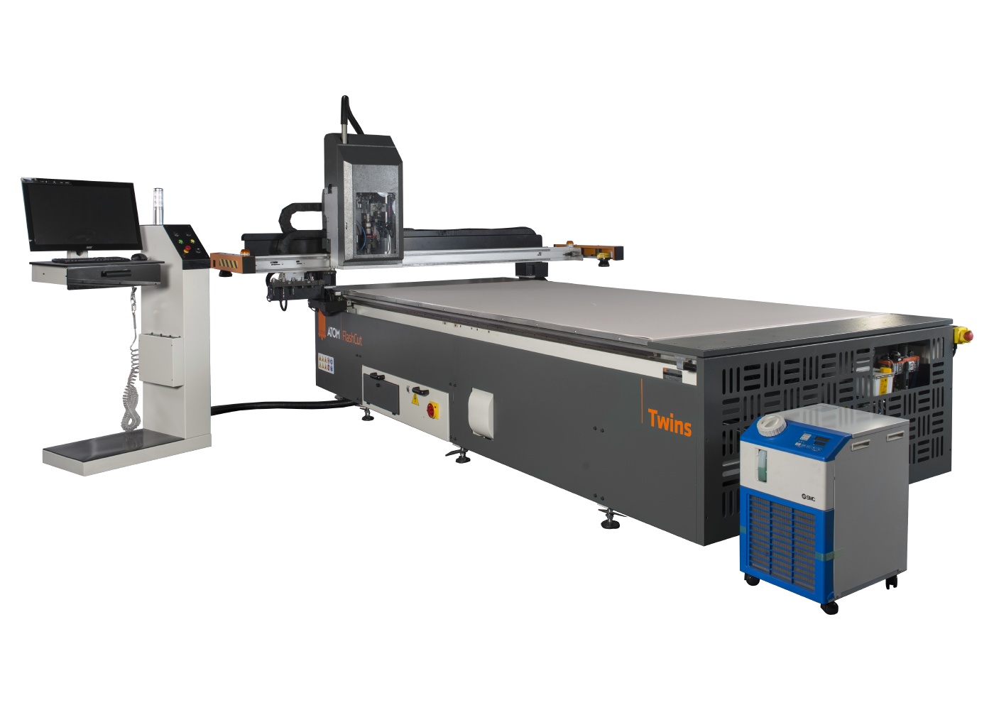 The ATOM Flashcut TWINS EMH Series is available in several configurations with either a static or conveyorized (belt feed) cutting surface capable of processing materials up to 50mm in thickness – cutting solutions for combined jobs.