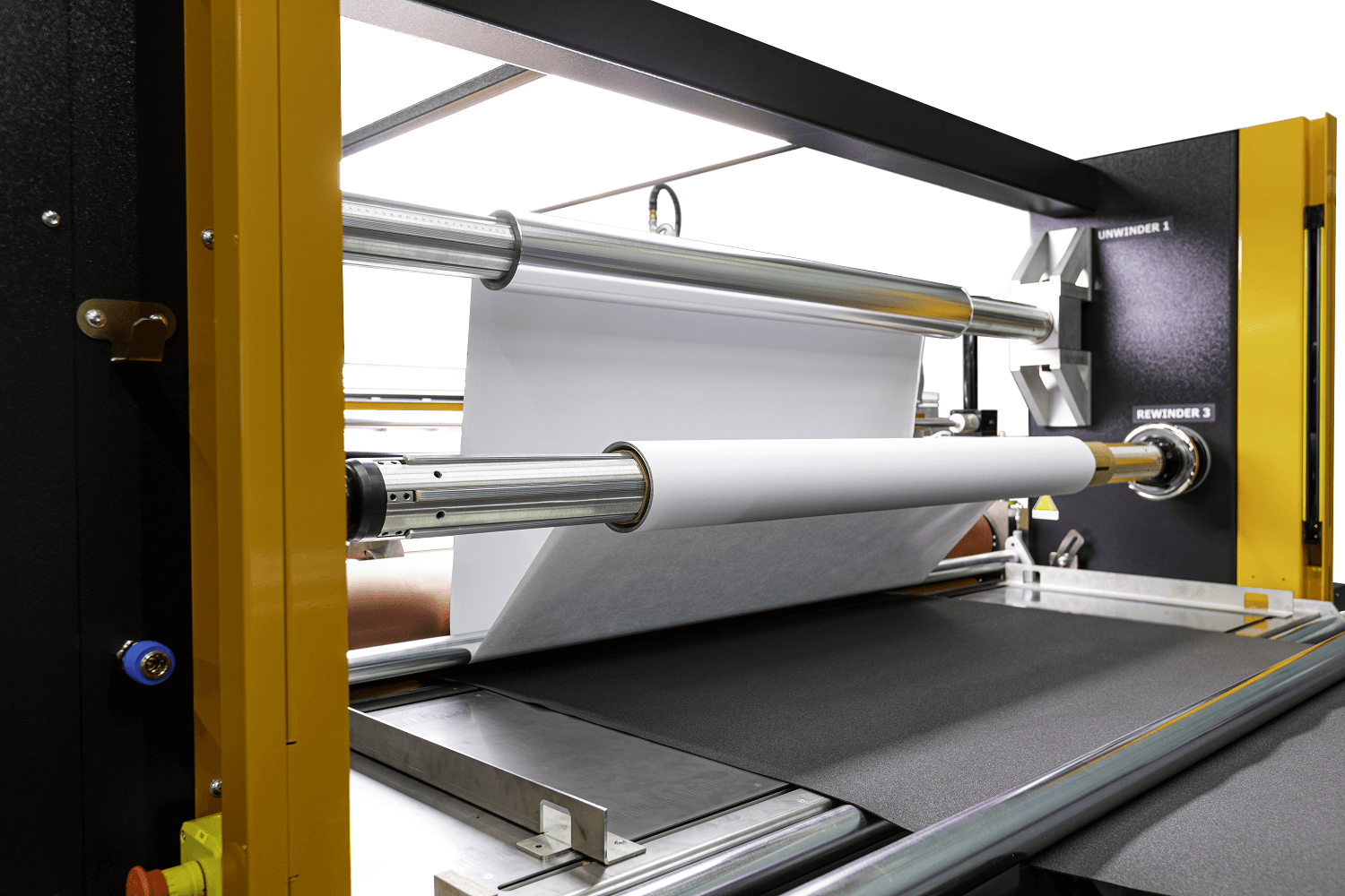 The IMESA K1 DS Double Sided Laminating System is the ideal laminator to applying self-adhesive papers or films to both the top and bottom of various materials including foams and rubbers, adhesive & non-adhesive tapes, foam tapes, fiberglass, non-wovens, technical textiles and similar materials. The version K1 DS main advantages over the K1 Easy Laminator is the ability to apply an adhesive transfer tape to both sides of foams or flexible materials in both roll and sheet form. In addition to featuring a second unwind for adhesive film; the model K1 DS also incorporates a second tension controlled winder for rewinding the adhesive protective liner. Additional features include a second heated nip roll (top and bottom heated) and more accurate tensioning controls for elastic or thin foam materials.