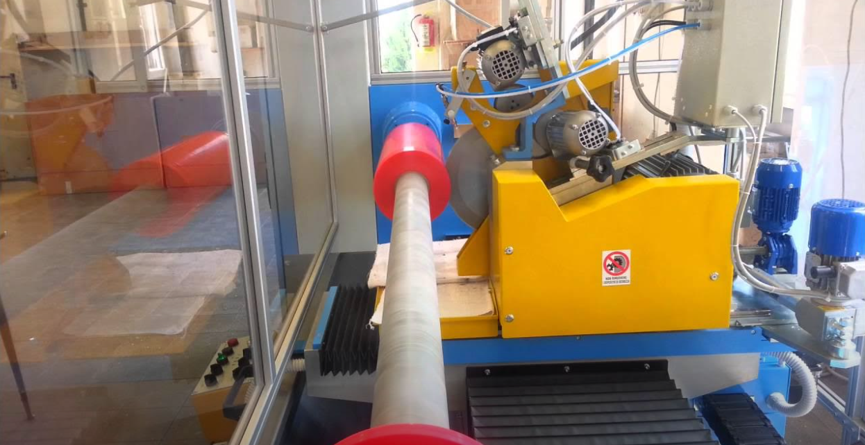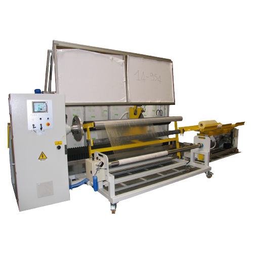 The FEBA model F500 can also be equipped with a single rotating saw blade (toothed blade) for cutting logs of polyethylene, protection film tapes, coated and non-coated plastic films, silicone paper and similar materials. A dust extraction device, with an off-line aspiration system, is also fitted to the machine to remove the dust-debris generated by the saw blade cutting system. Due to the excessive weights of these materials, the F500 can be equipped with a semi-automatic or fully automatic trolley to aid in the loading and unloading of the materials.