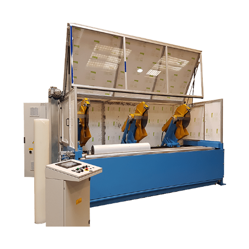 he FEBA 3-Head Sawing System is equipped with 3 fully independent 550mm saw-blade slitting heads each driven by a 3kW 7.5AC motor with adjustable speeds from 10 to 2800 RPM. While the first slitting unit is fixed (edge trim), the other two can be positioned along the axis according to the slit width requested. The slitting heads are positioned in precision-ground linear bearings and the transversal displacement is performed by OMRON LINEAR MOTORS that guarantees accuracy and rapid positioning.